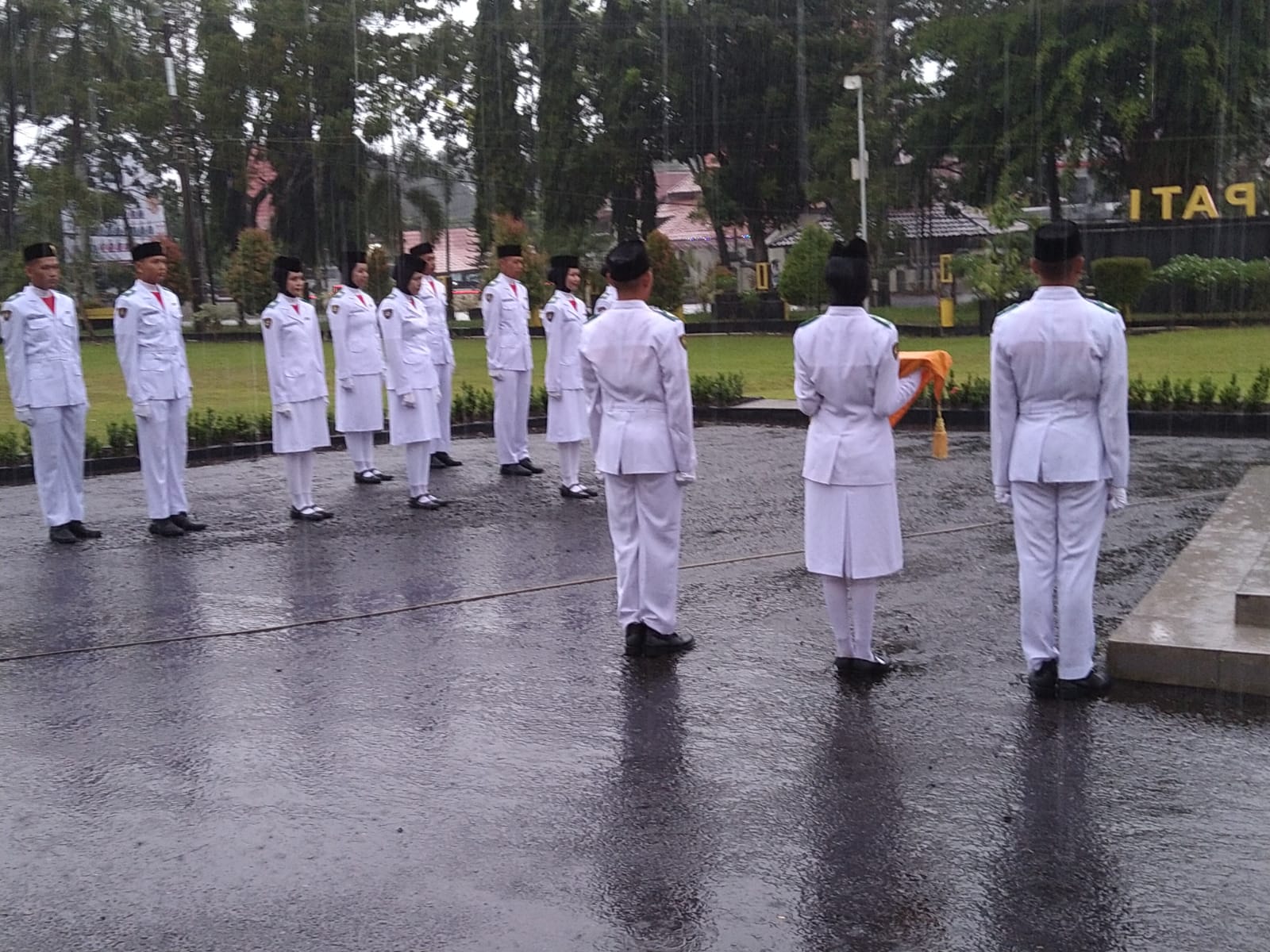 Sekitar pukul 17.00 WITA, langit yang mendung sejak siang akhirnya menurunkan hujan lebat. Namun, hal ini tidak mengurangi semangat dan keteguhan para anggota Paskibraka dalam menjalankan tugas mereka. Dengan langkah tegap dan penuh disiplin, mereka melaksanakan prosesi penurunan bendera dengan sempurna.
